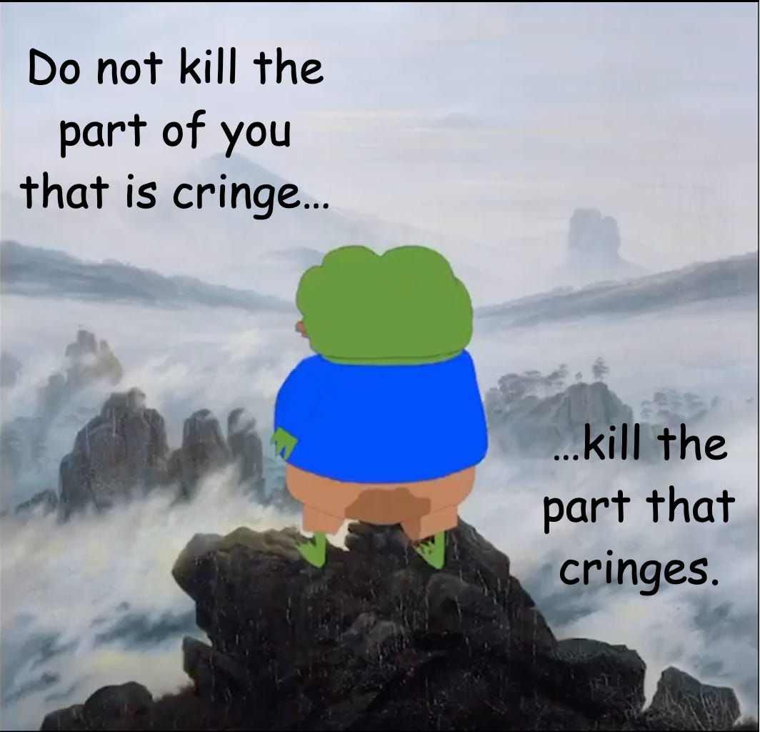At this point, it will serve to define some terms that, in internet parlance, relate to notions of irony and sincerity; specifically, the dichotomy of “based” and “cringe”.