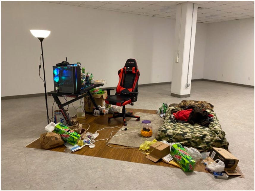 The title of the piece refers both to the video’s soundtrack, a pitch shifted, accelerated “Nightcore” remix of the Y2K-era Eurodance anthem “Around the World (La La La La La)” as well as the larger installation, a waste-filled bedroom seemingly devoid of any worthwhile life. The visual component of the work consists of a series of images that occur in such quick succession, roughly seven per second, so as to function almost subliminally. The deluge of visual referents overwhelms our ability to process them, thereby recreating the experience of the internet today in a hyper-distilled and accelerated fashion. Describing the work on his Instagram page, the artist writes: